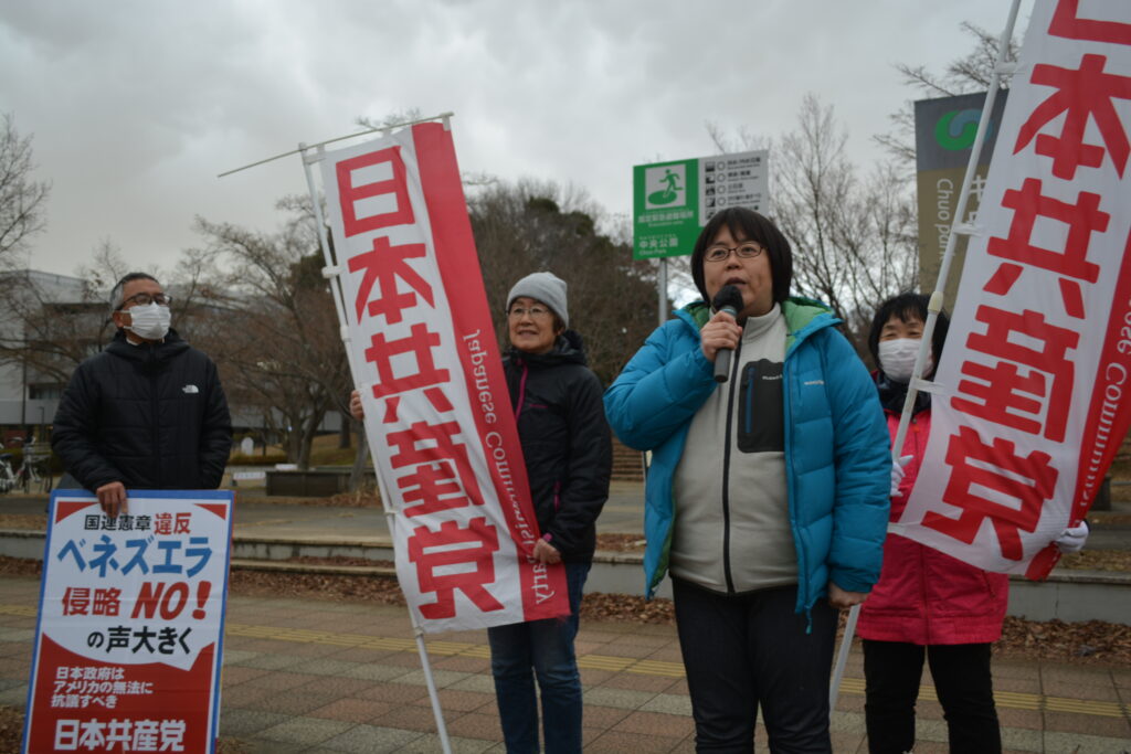 山中まゆみ市議は「どんな理由があっても、主権国家に対して軍事攻撃を行い、指導者を拘束し連行する権利はどの国にも与えられていない」と強調。各国から「国際法違反」の批判の声がでている中で、日本の高市早苗首相が、国際法違反に対して懸念さえ示していないことに対し、「いつまで日米同盟のアメリカ言いなりを続けるのか。日本のあり方が厳しく問われている」と批判しました。また、高市首相が2月投開票で衆議院解散・総選挙の検討に入ったとの10日の報道を紹介し、「私たち日本共産党は、憲法を真ん中に暮らしや平和の問題など国民的な共同を広げて、国民の声が届く政治を皆さんと一緒につくっていきます」と力説しました。(12日・新聞赤旗日刊紙より)