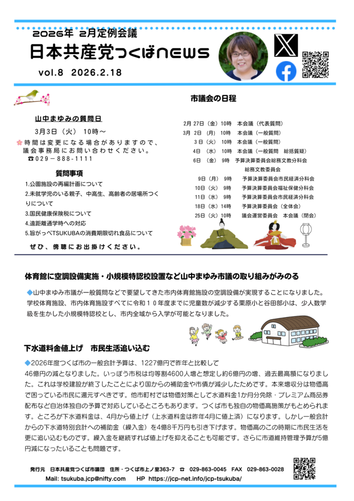 ニュース 日本共産党つくばnews vol.8 山中まゆみ市議の報告 2026.02.19 山中まゆみ市議が質問する3月議会が始まります。 3月3日(火)が山中まゆみ市議の質問日となっています。ぜひ傍聴にお出かけください。 🔶また、今回のニュースでは「体育館に空調設備実施・小規模特認校設置」など山中まゆみ 市議が兼ねてから訴えていた取り組みがみのり報告されていますのでご覧ください。