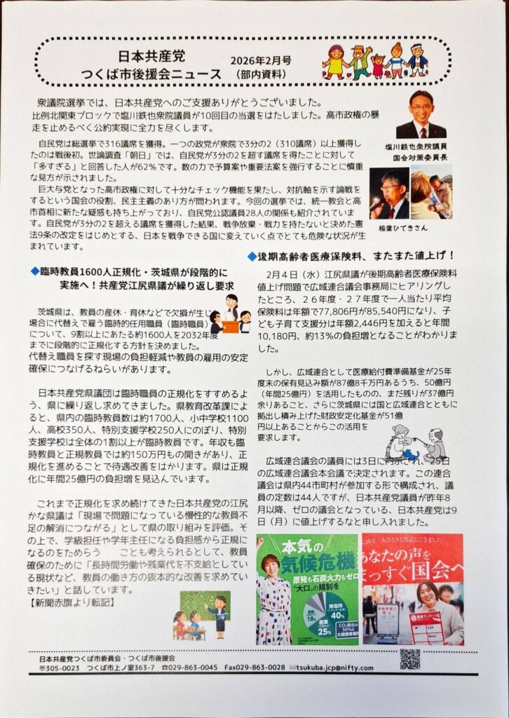 日本共産党つくば市委員会後援会ニュース 2026年2月号 ご覧ください。