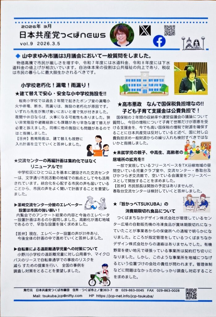 日本共産党つくばnews VOI.9 山中まゆみ市議の3月議会質問内容です